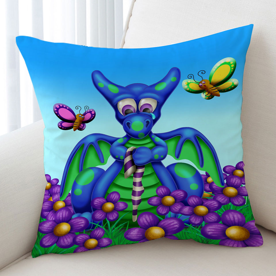 Cute Blue Dragon with Purple Flowers Kids Throw Pillow