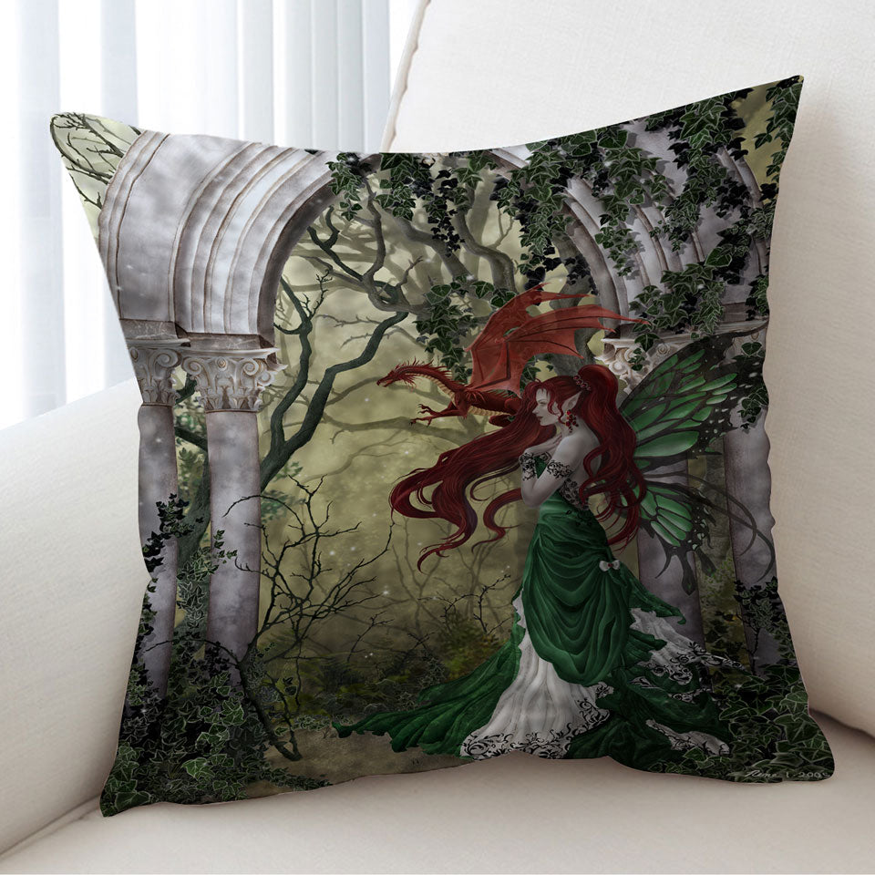 Fantasy Art Beautiful Redhead Green Fairy and Her Dragon Throw Pillow