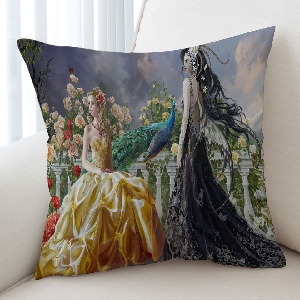 Fantasy on the Rose Balcony Light and Dark Princesses Throw Pillow