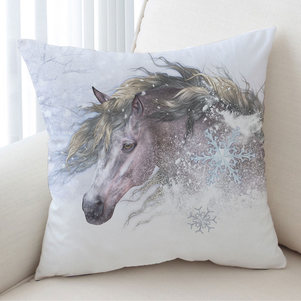 Winter Snow and Bright Hair White Horse Throw Pillow
