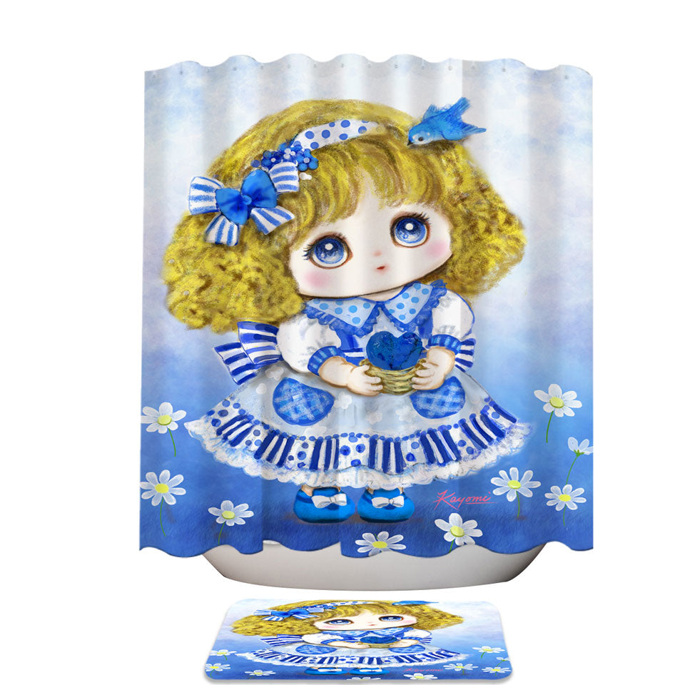 Kids Drawings Blue Girl and Daisy Flowers Shower Curtain
