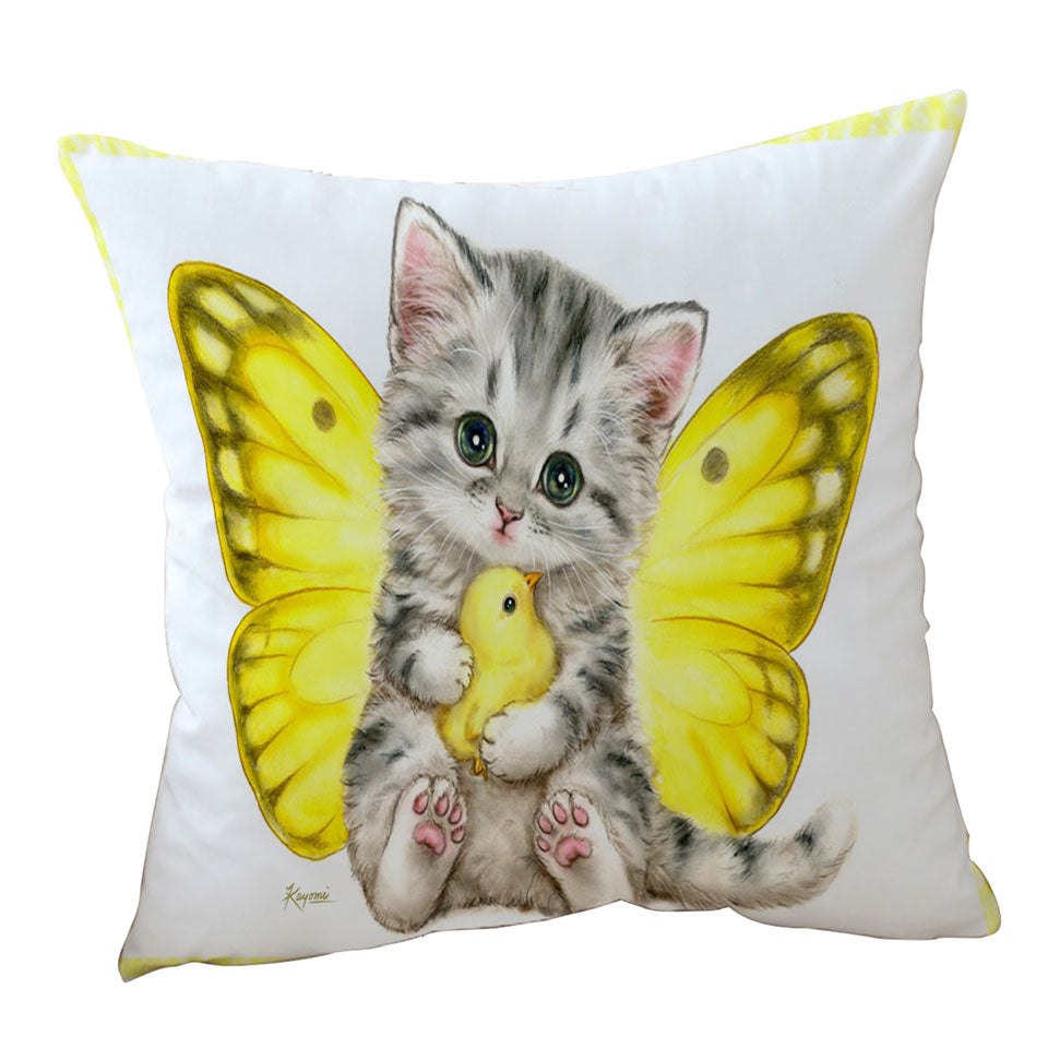 Sweet Yellow Butterfly Kitten and Chick Throw Pillow
