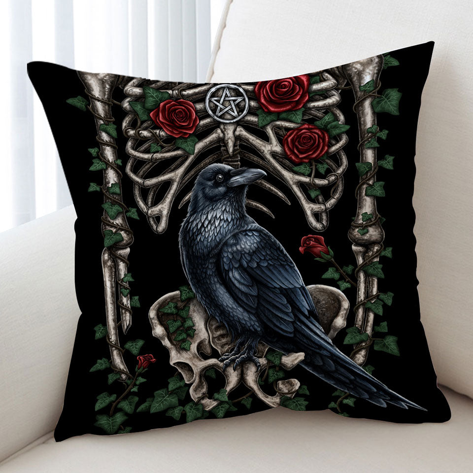 Dark Art Roses Human Skeleton and Crow Throw Pillow