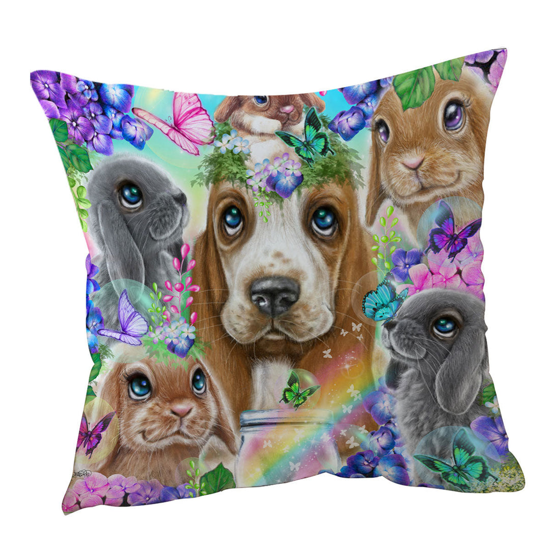 Cute Basset Hound Bunnies and Butterflies Throw Pillow