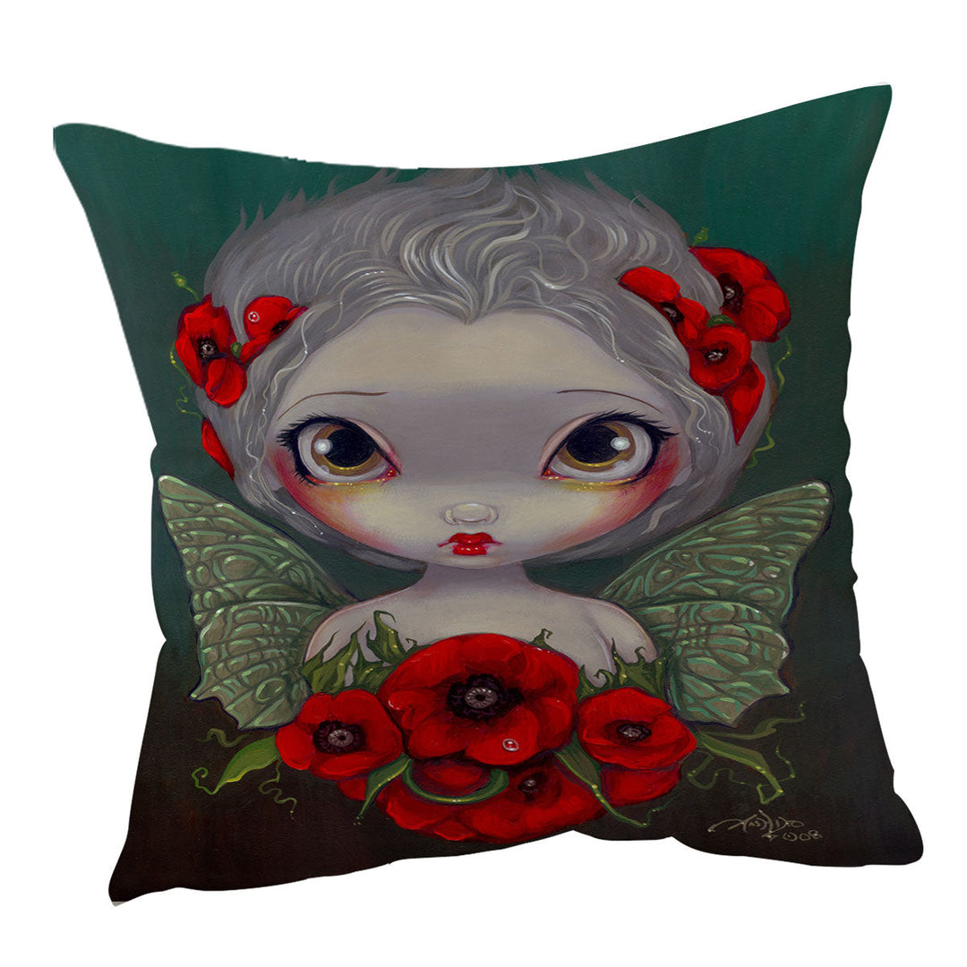 Lovely Big Eyed Fairy Portrait with Red Poppies Throw Pillow