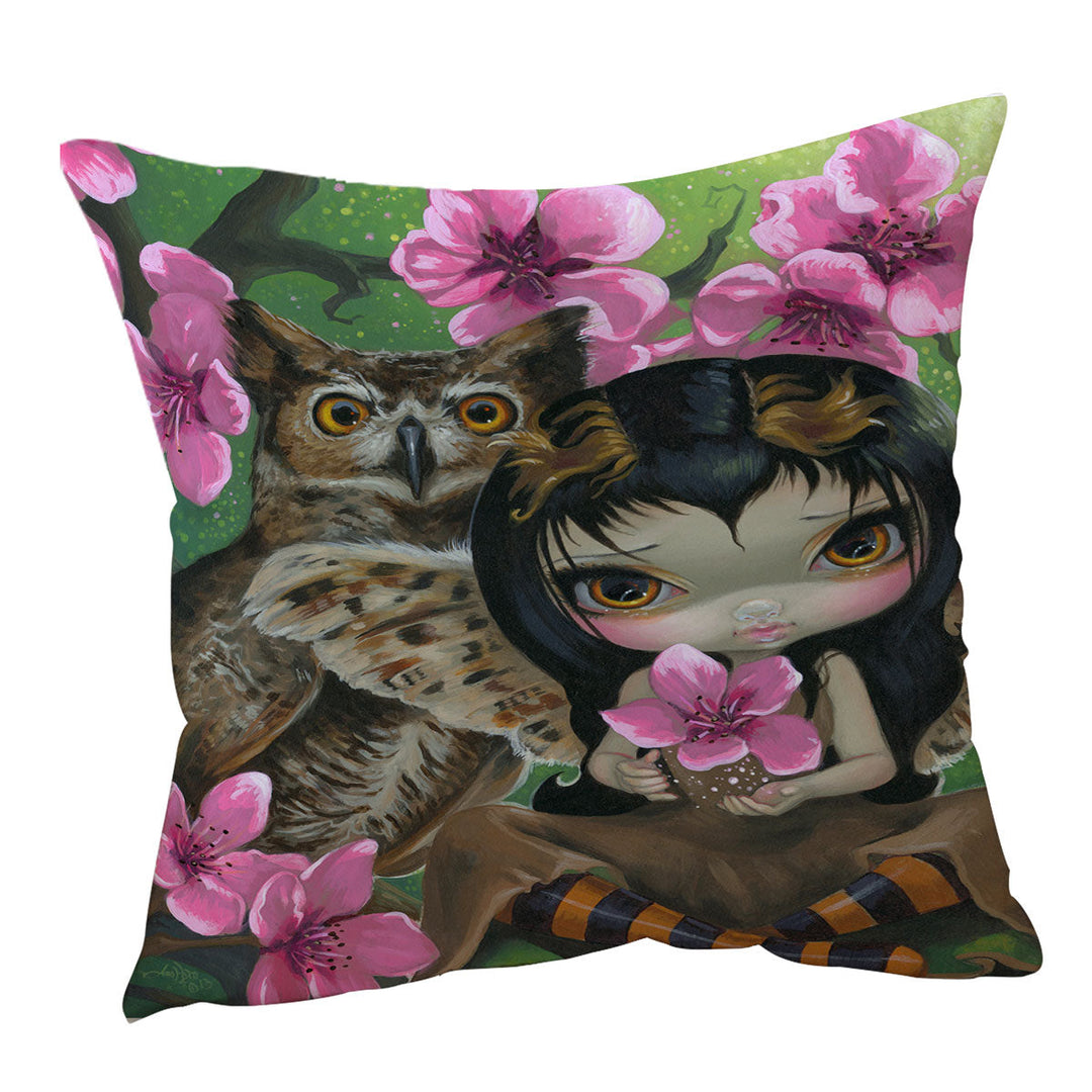 Owl Fairy Owlyn in the Springtime Cherry Blossom Throw Pillow