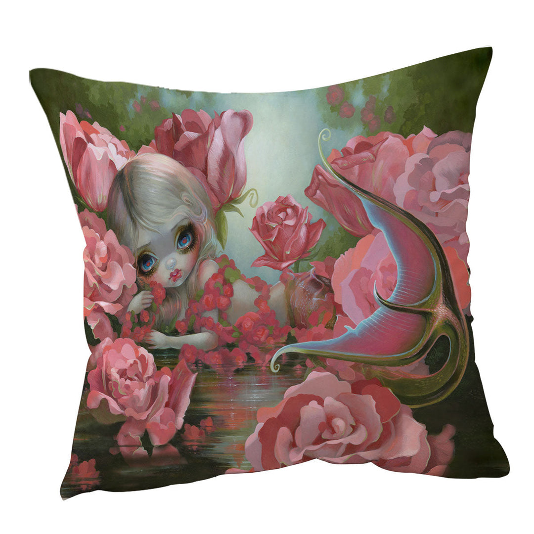 Pink Fantasy Art Mermaid with Roses Throw Pillow