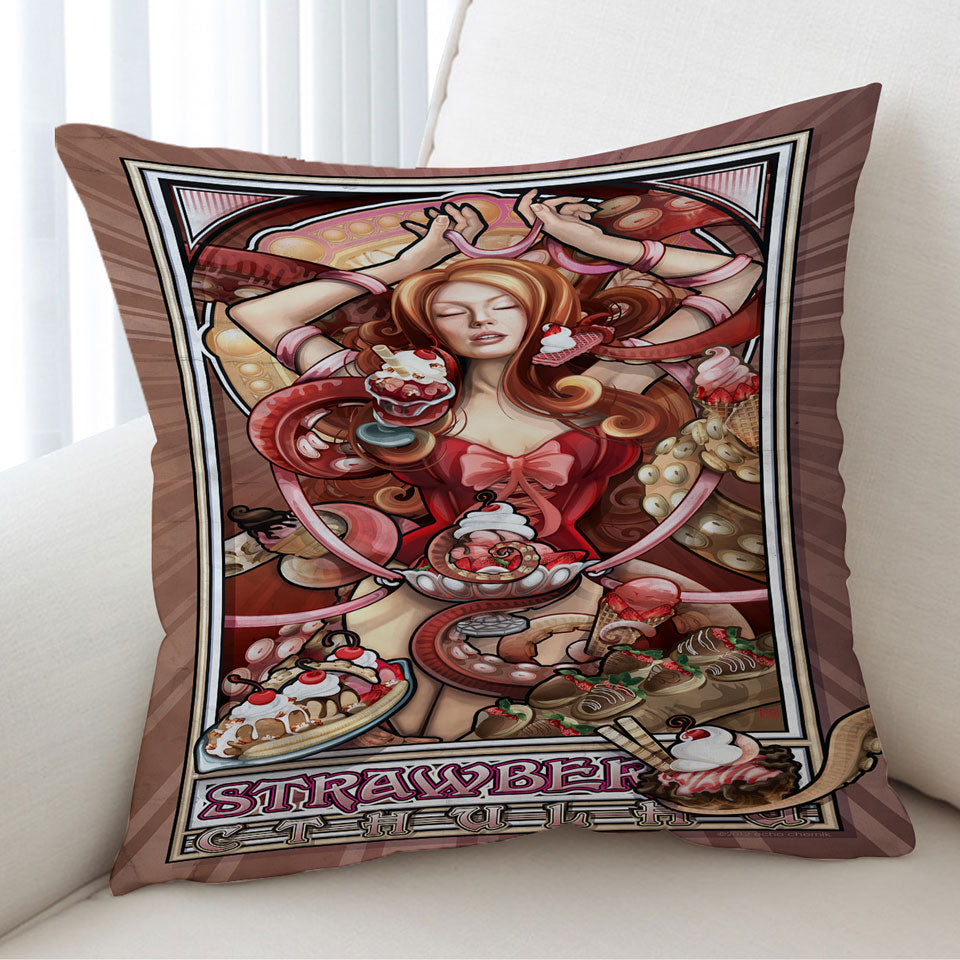 Strawberry Ice Cream Cthulhu and Beautiful Woman Throw Pillow