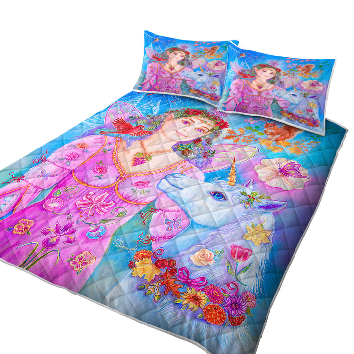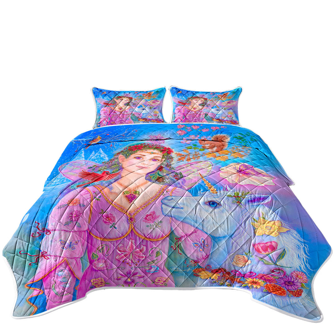 Beautiful Fairy Unicorn Squirrel and Birds for Kids Quilt