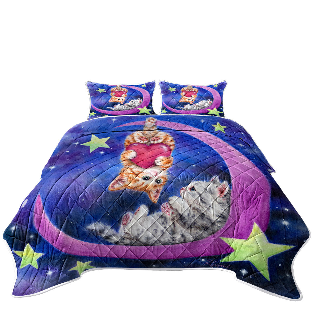 Cats Art Romantic Moon Space Starts and Kittens Quilt