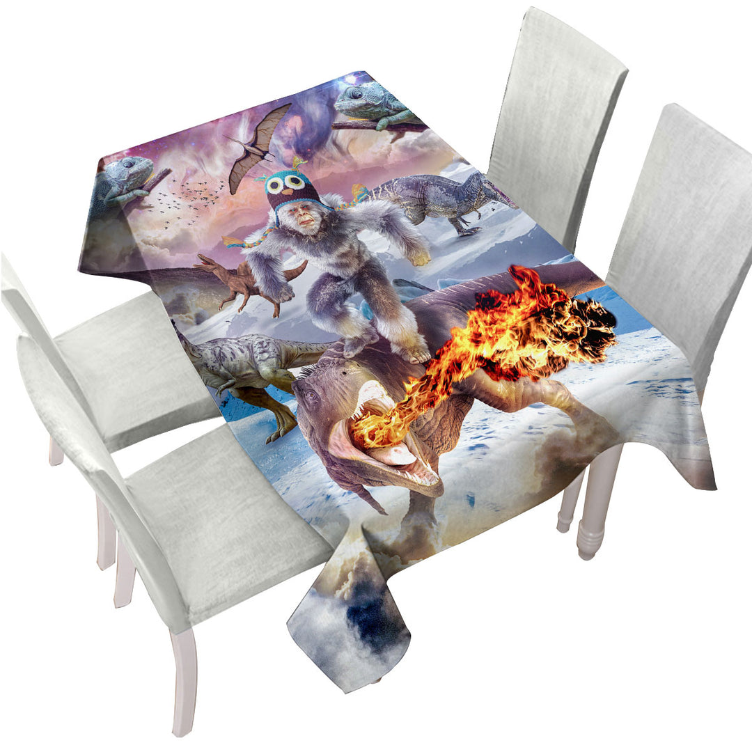 Funny Crazy Bigfoot Yeti Sasquatch Riding Dinosaur Tablecloth