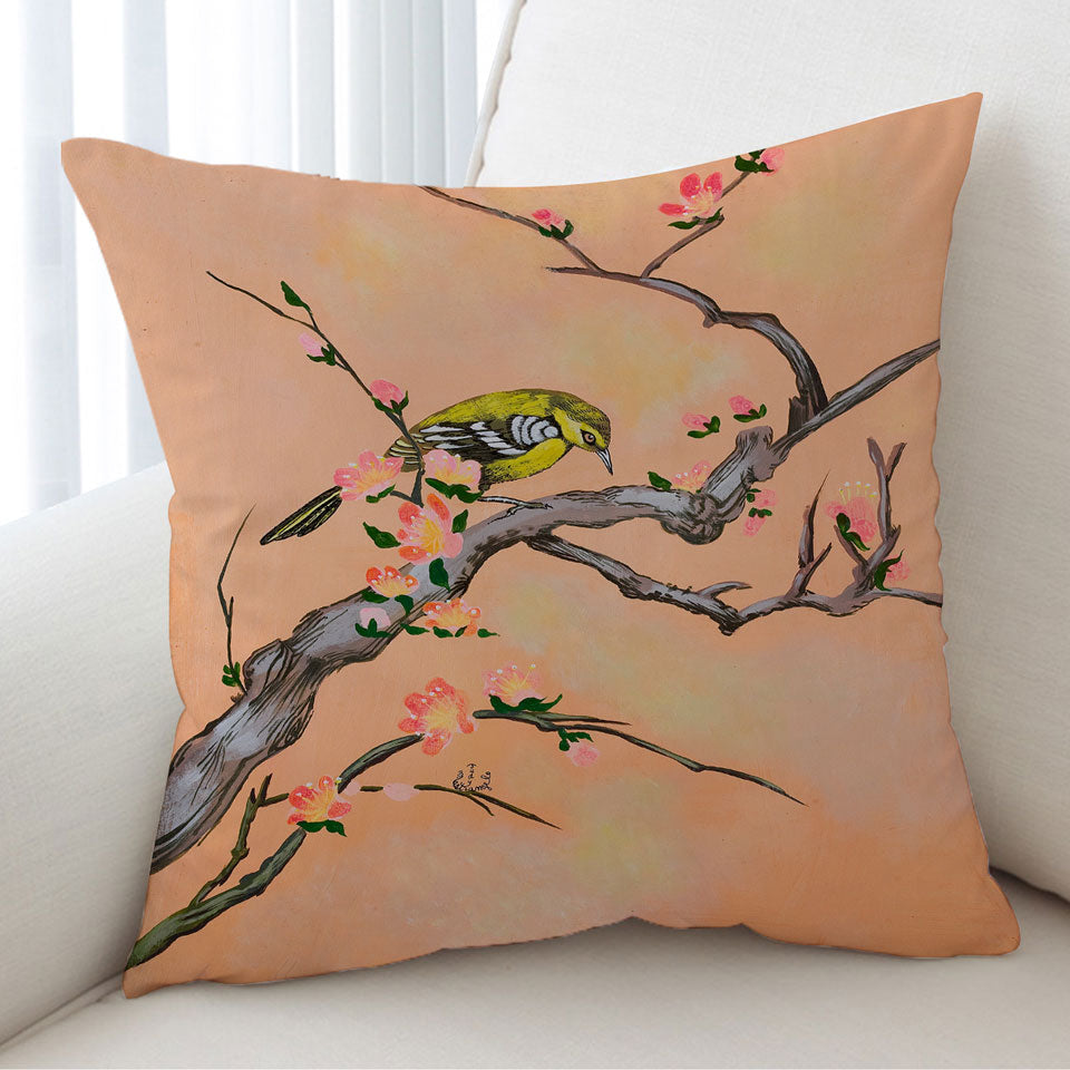 Japanese Art Painting Bird in Cherry Tree Throw Pillow