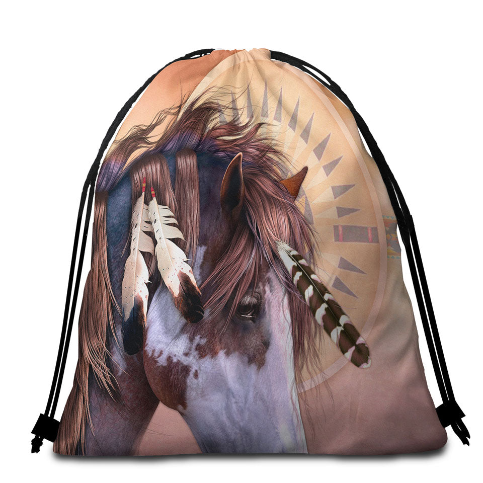 Native American Spirit Feathers Haired Horse Round Beach Towel