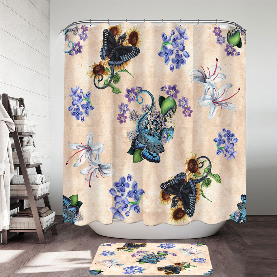 White Purple Flowers and Butterflies Dragons Shower Curtain