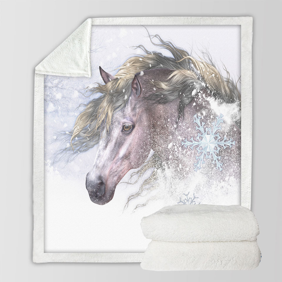 Winter Snow and Bright Hair White Horse Throw Blanket