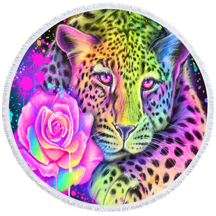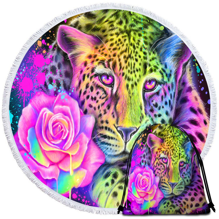 Artwork Neon Rainbow Leopard Round Beach Towel