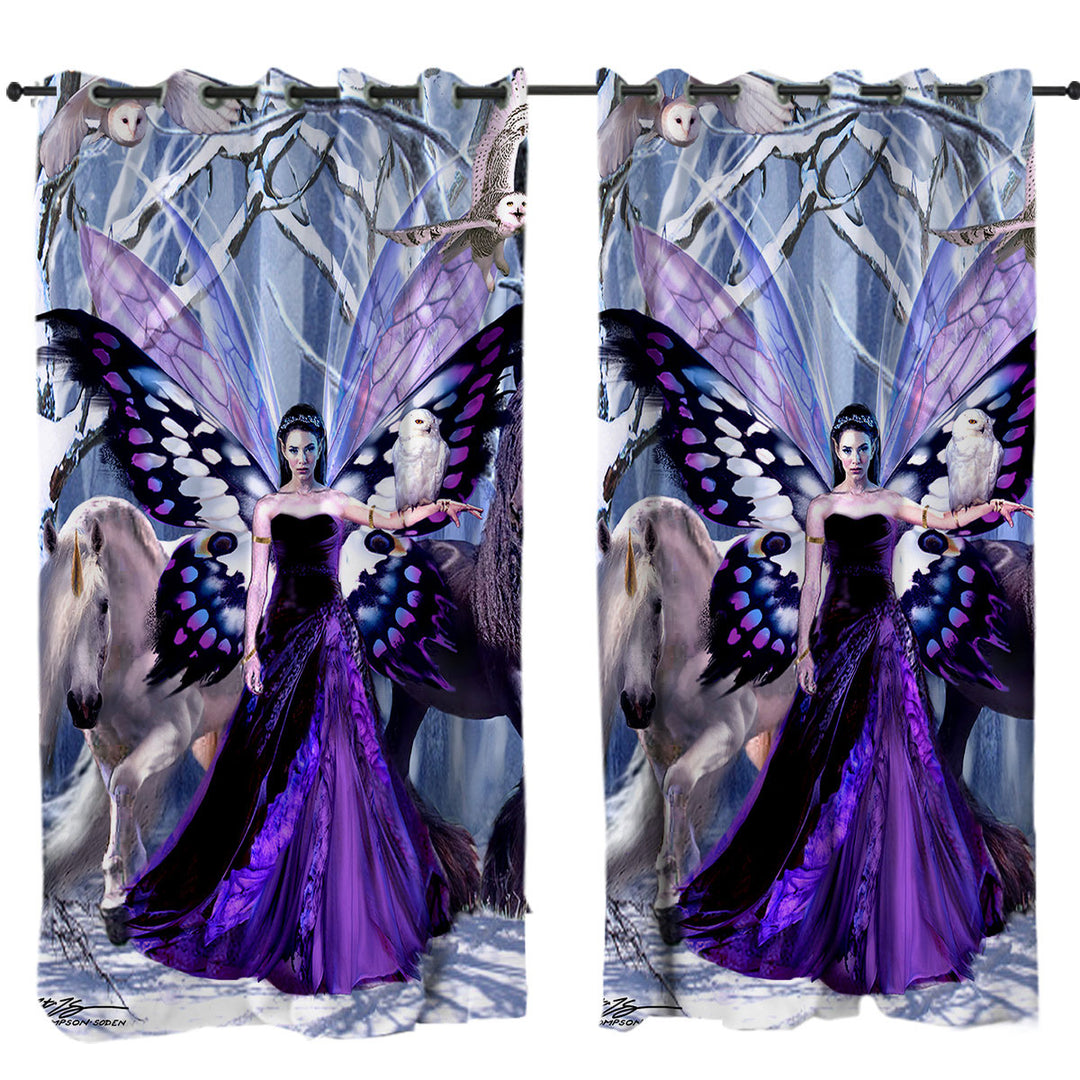 Snowy Forest Owls Horses and Purple Fairy Queen Curtain