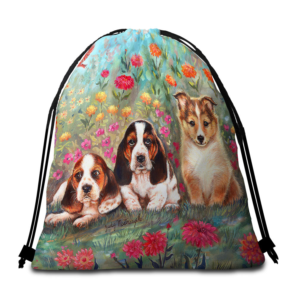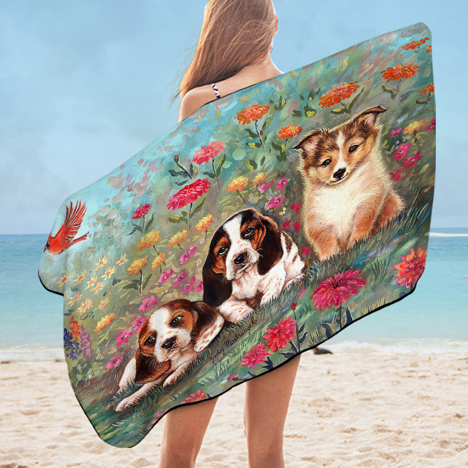 Art Painting Cute Dog Puppies and Flowers Microfiber Beach Towel