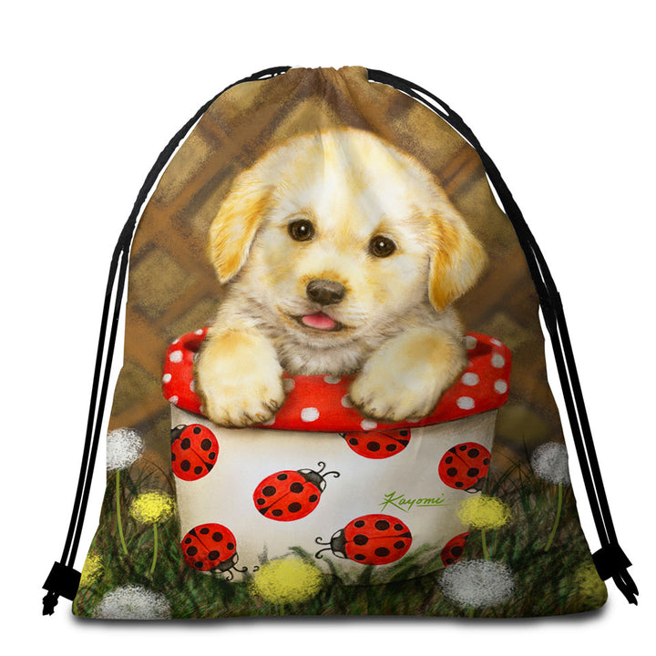 Cute Dog Puppy in Ladybug Flower Pot Round Beach Towel