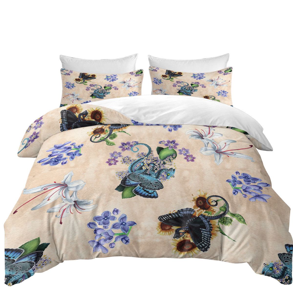 White Purple Flowers and Butterflies Dragons Duvet Cover