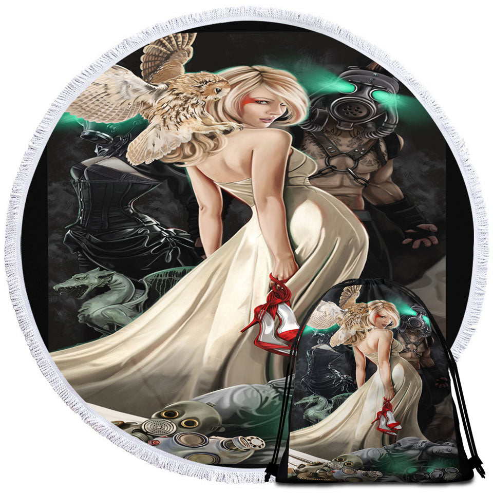 Fiction Art Beautiful Blond Girl and Owl Round Beach Towel