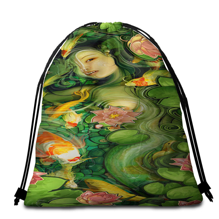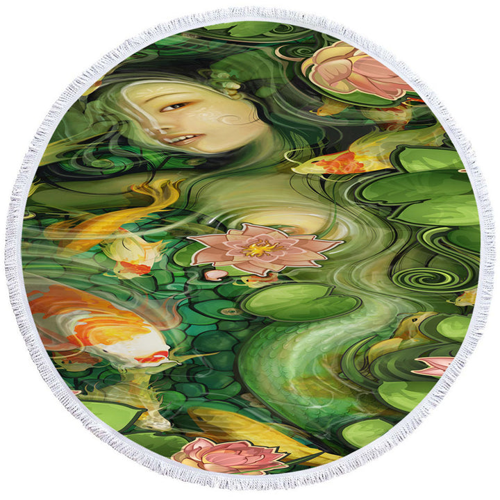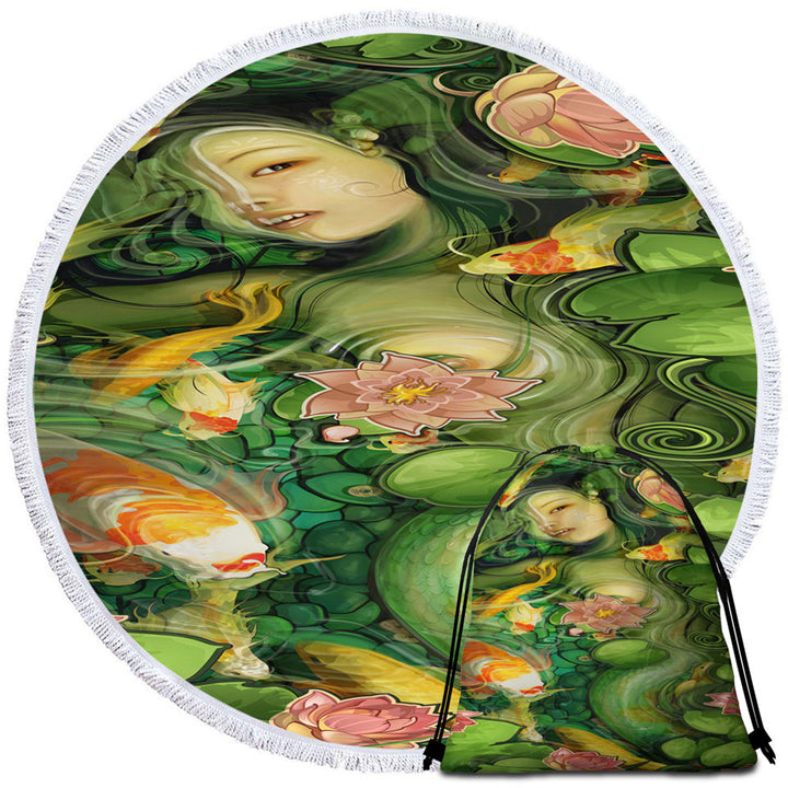 Japanese Koi Water Lilies and Beautiful Girl Round Beach Towel