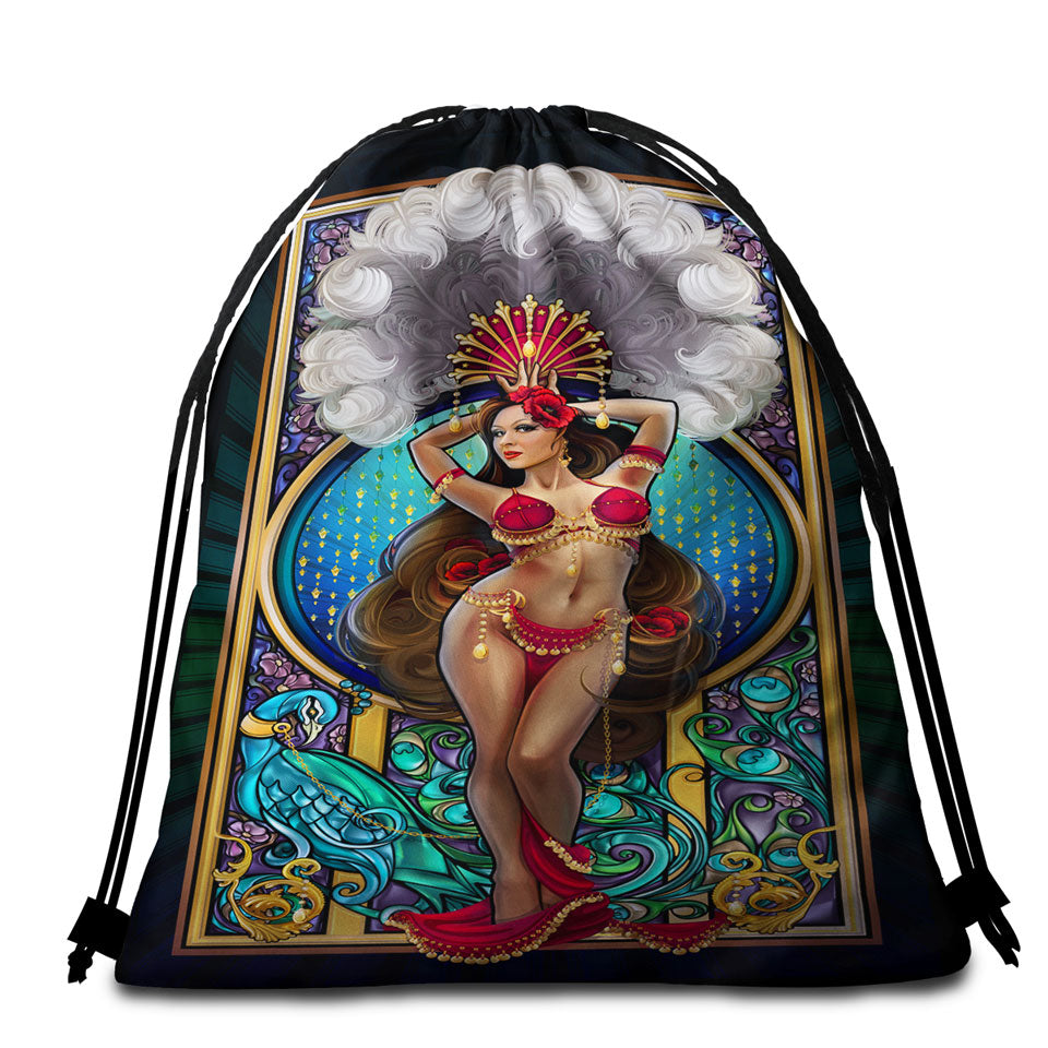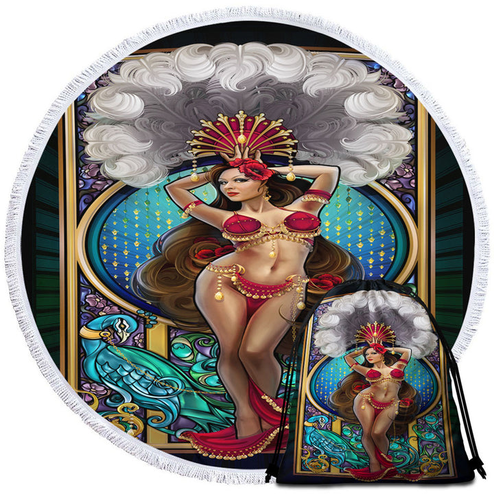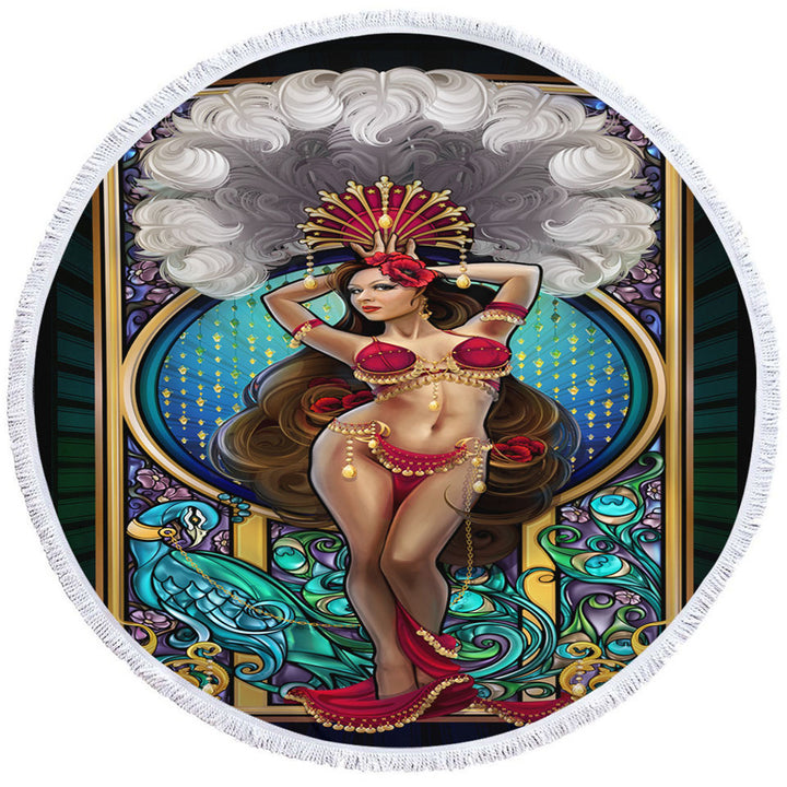 Peacock and Sexy Burlesque Belly Dancer Round Beach Towel