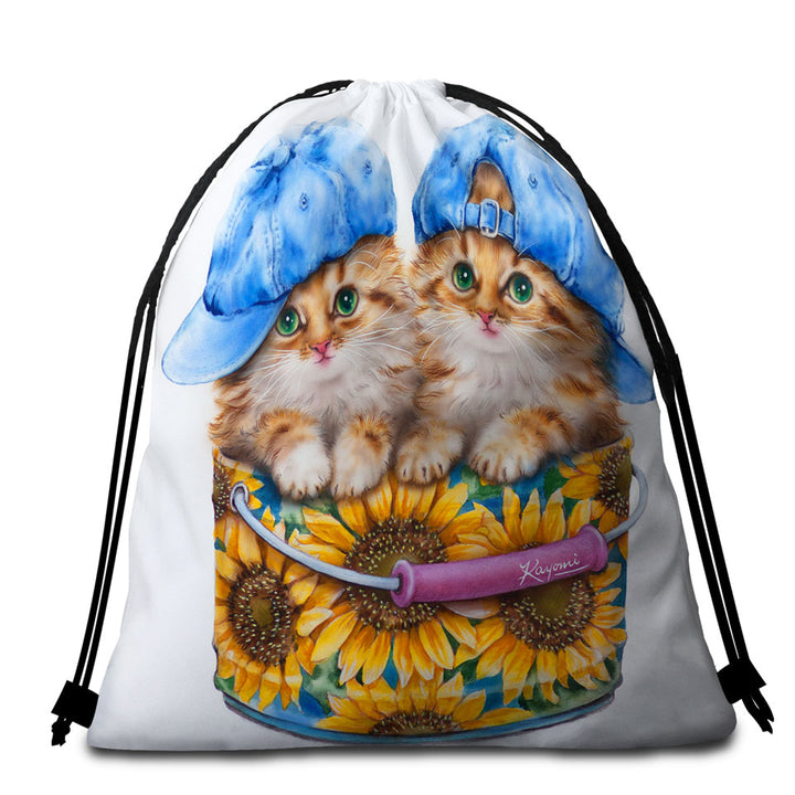 Adorable Funny Kittens Sunflower Bucket Round Beach Towel