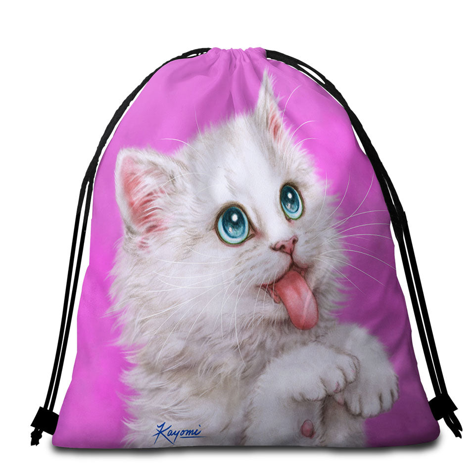 Funny Cats Hungry White Kitty Cat over Pink Round Beach Towel