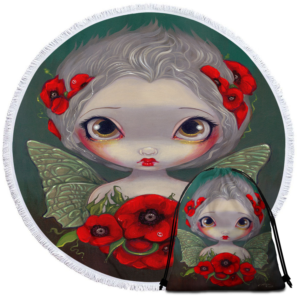 Lovely Big Eyed Fairy Portrait with Red Poppies Round Beach Towel