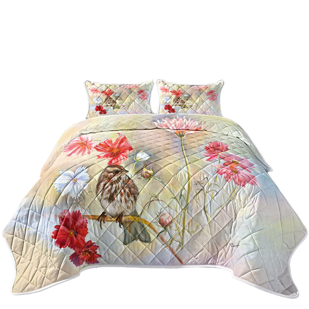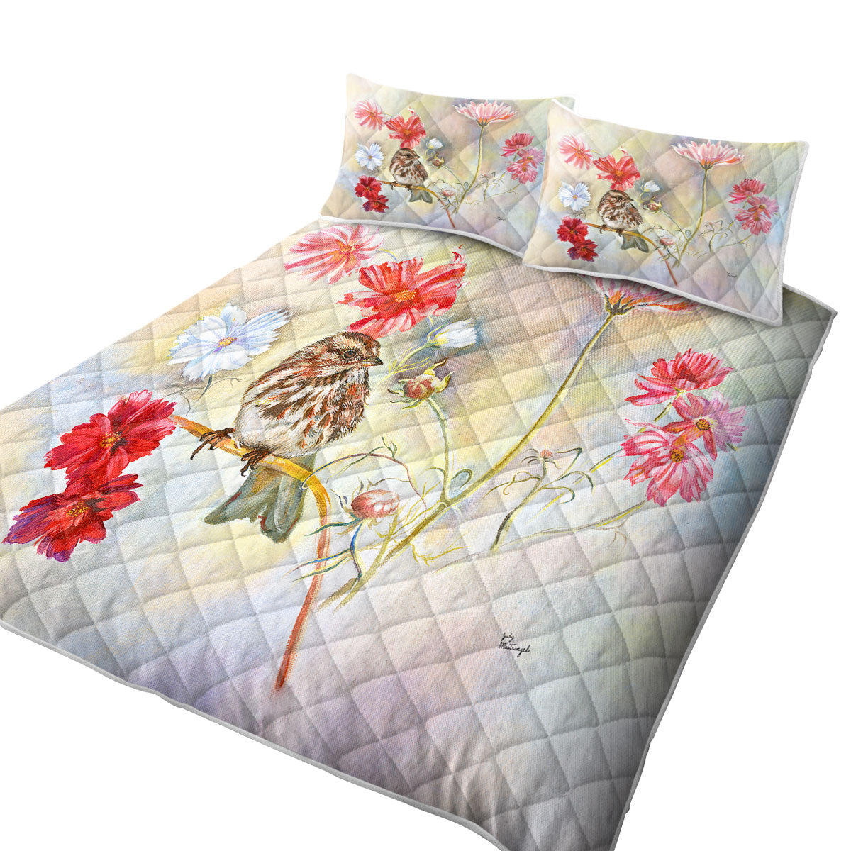 Floral Art Sparrow Bird in Cosmos Flowers Quilt