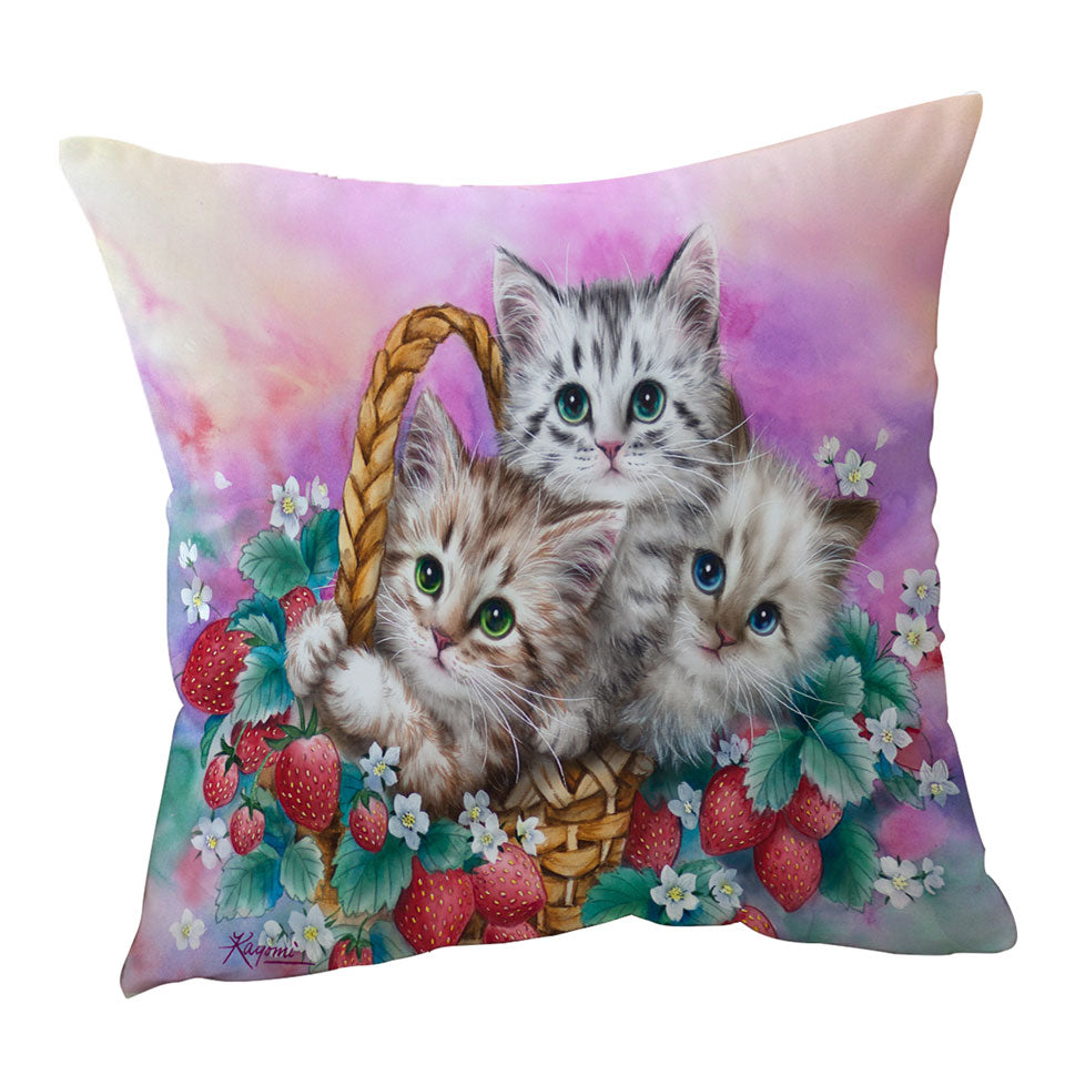 Adorable Strawberry Basket with Kittens Throw Pillow