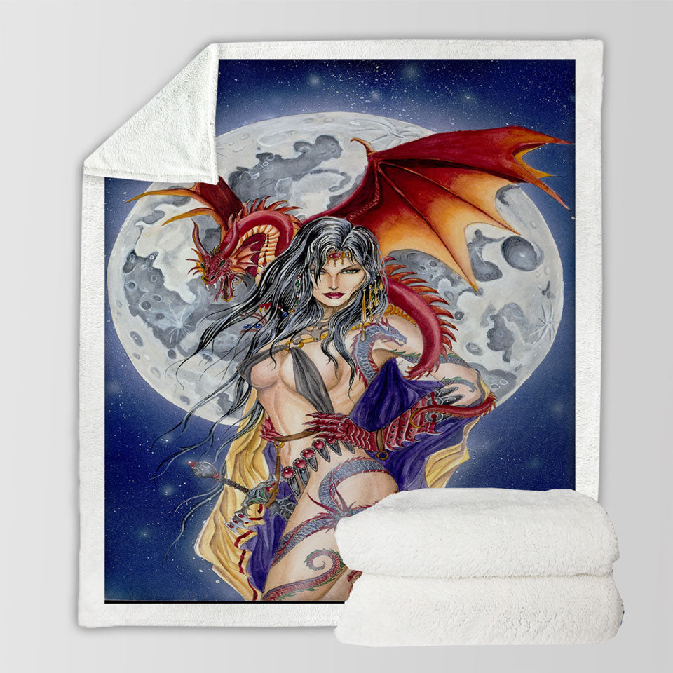 Cool Fantasy Art Sexy Warrior Lady and Her Moon Dragon Throw Blanket