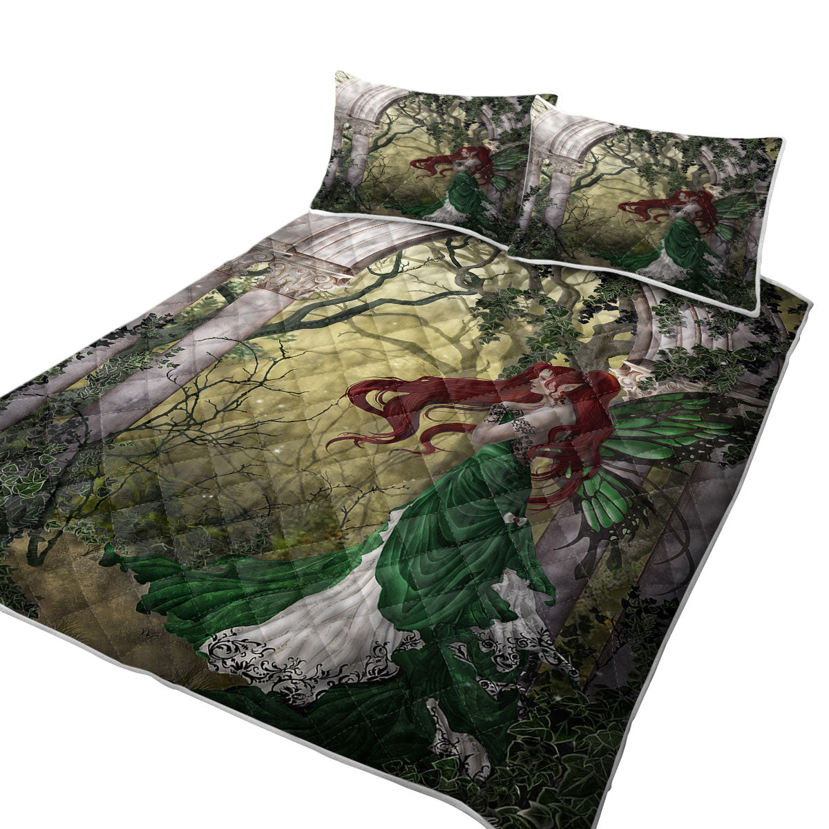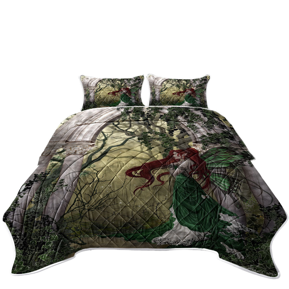 Fantasy Art Beautiful Redhead Green Fairy Quilt