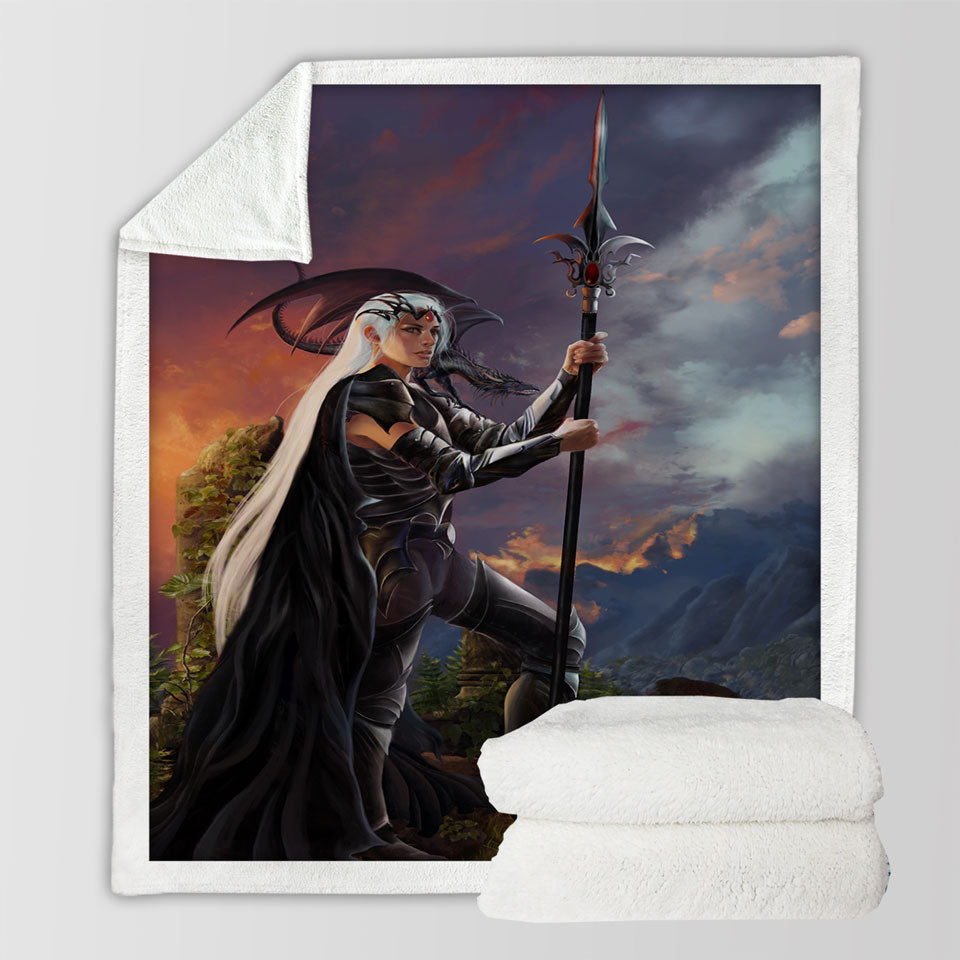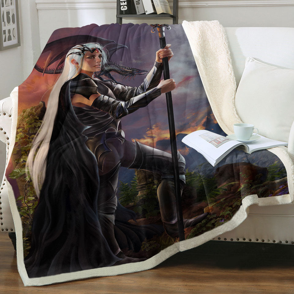 Fantasy Art Burning Valley and Dragon Girl Warrior Throw Blanket