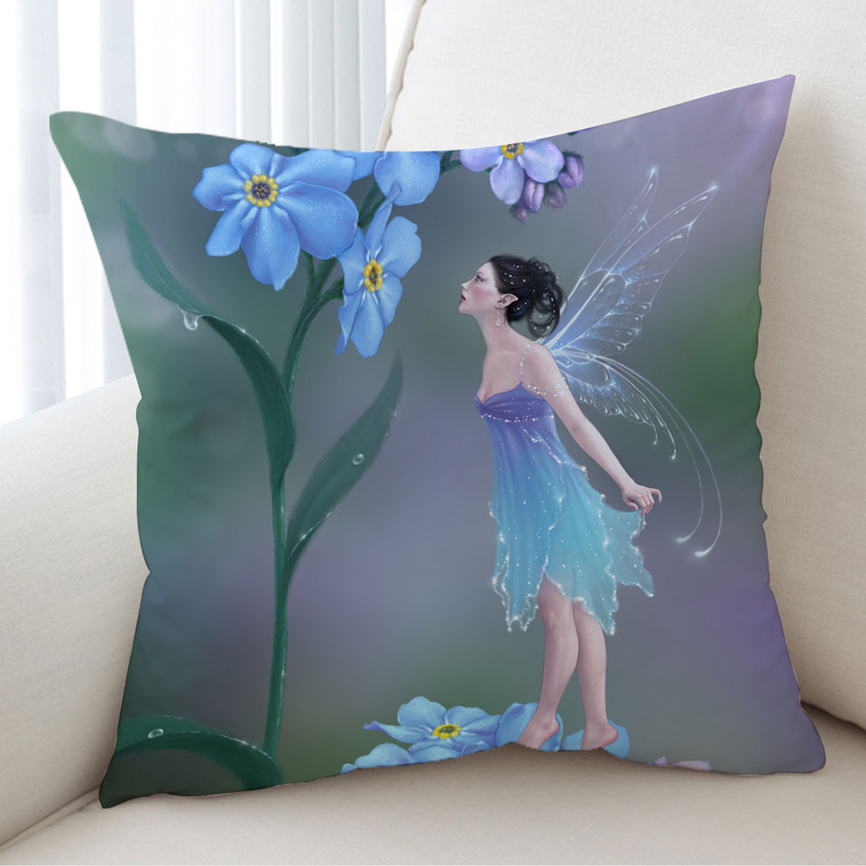 Cute Little Fairy and Purplish Blue Flowers Throw Pillow