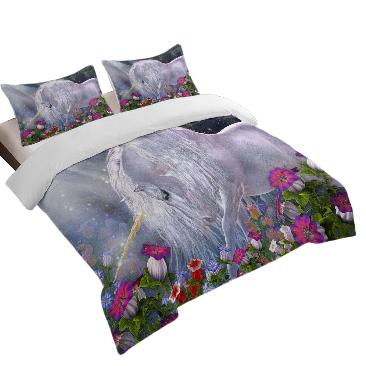 Fantasy Art Beautiful Flowers and Pure White Unicorn Duvet Cover