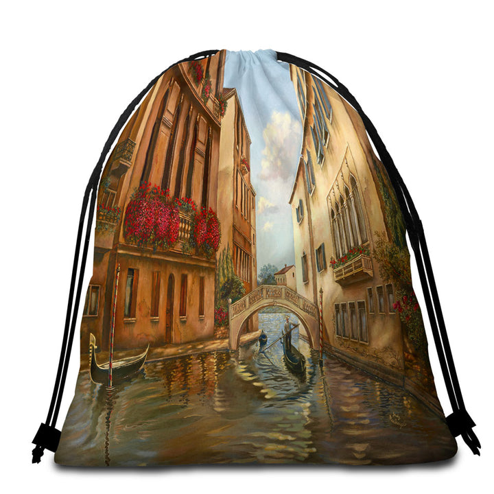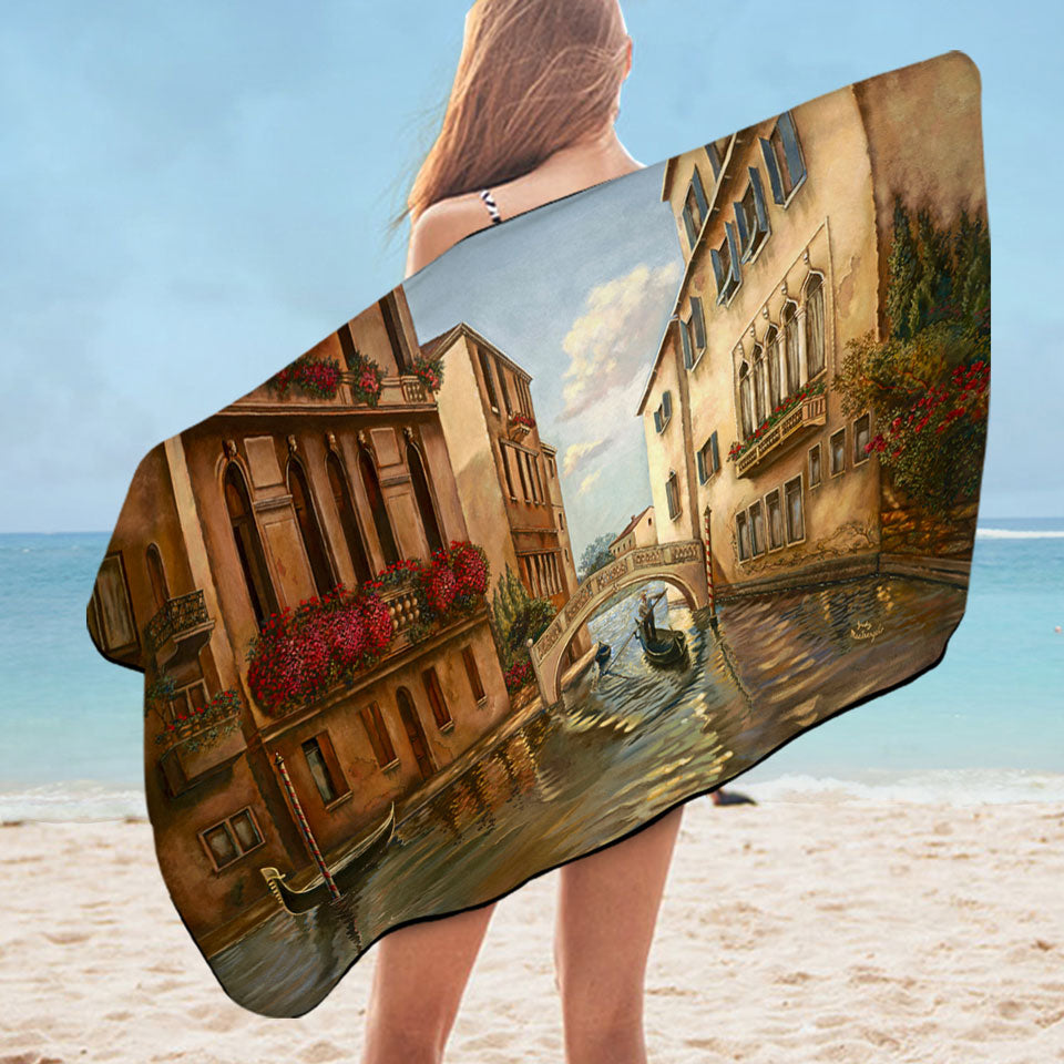 Venetian City Canal and Gondola Art Painting Microfiber Beach Towel