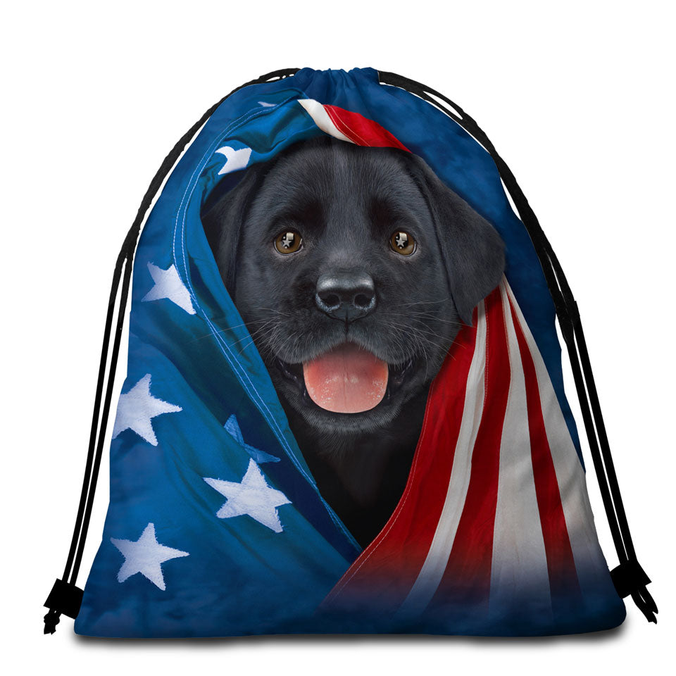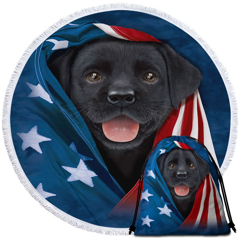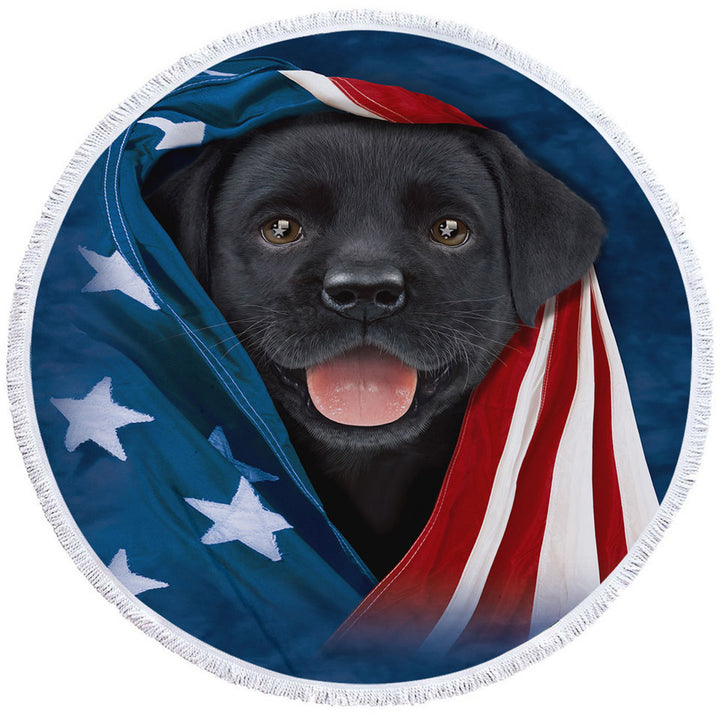 USA Flag Cute Black Labrador Puppy Round Beach Towel