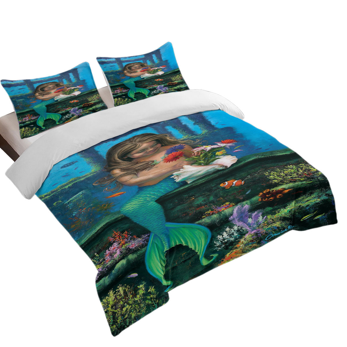 Cute Girl Mermaid and Underwater Flowers Duvet Cover