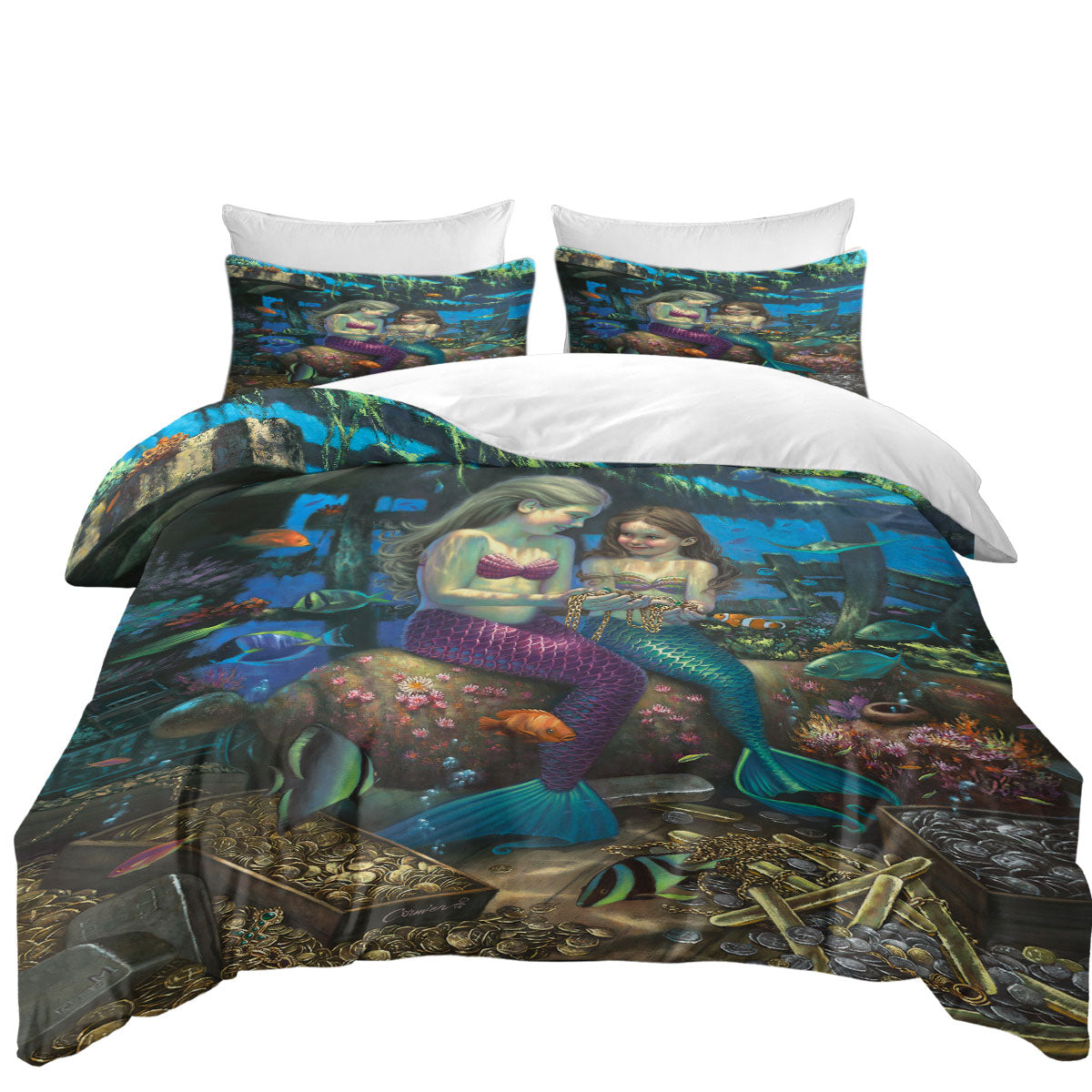 King Duvet Cover set with Gold Treasure Girls Mermaids Angel of the Deep
