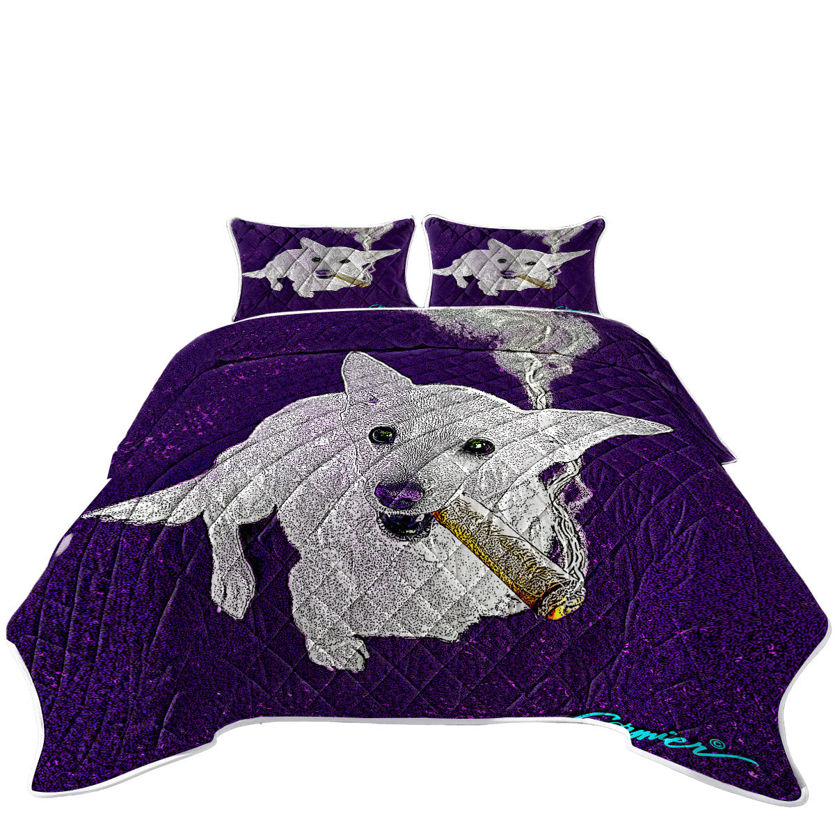 White Purple Artistic Drawing Smoking Dog King Size Bedspreads