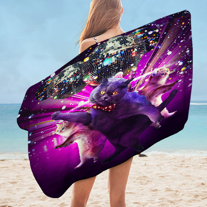 Crazy Funny Cats Cool Disco Cat Rave Microfiber Beach Towel