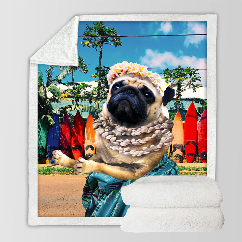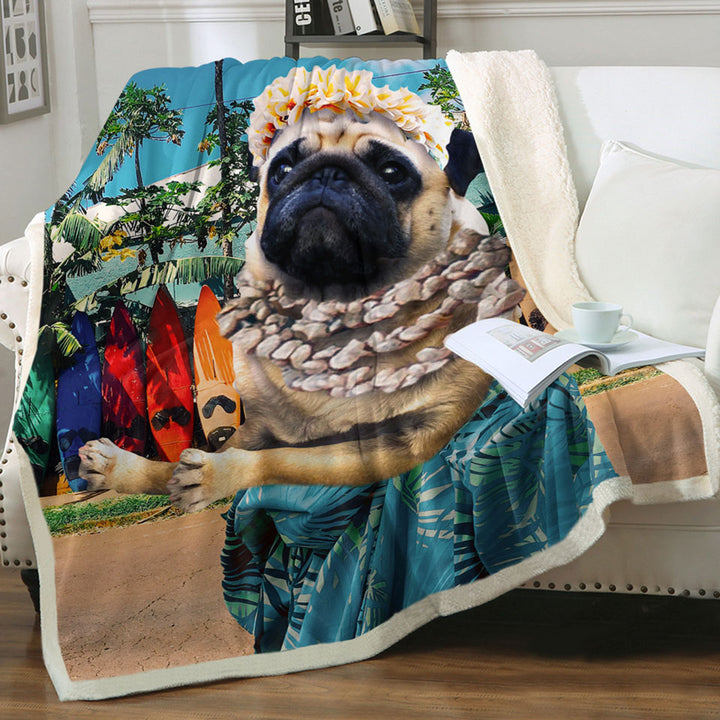 Funny and Cute Aloha Girl Pug Dog in Hawaii Throw Blanket