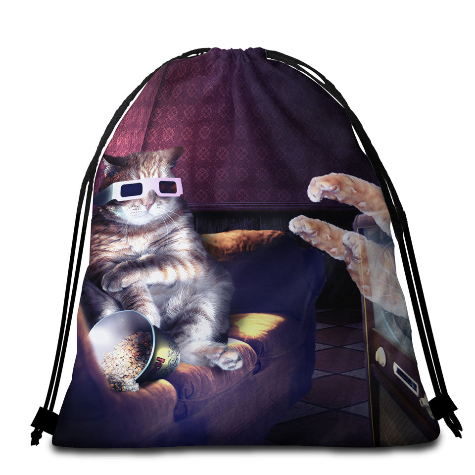 Funny Cat Watching a 3D Horror Movie Cool Art Round Beach Towel