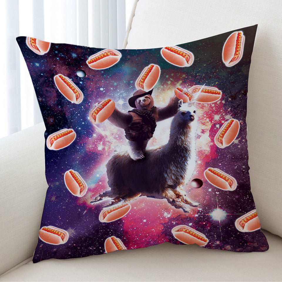 Funny Hot Dogs Space Cowboy Sloth on Llama Unicorn Throw Pillow