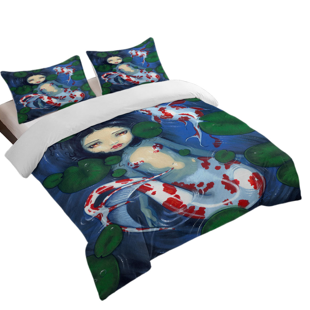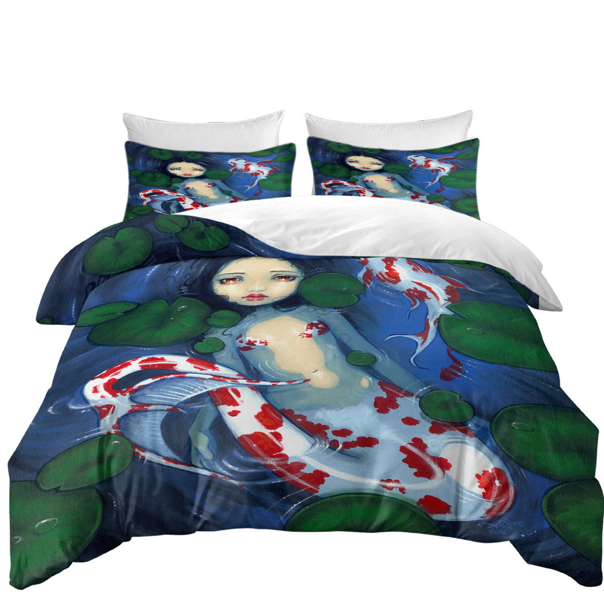 King Size Duvet Cover with Japanese Garden Lily Pads and Koi Pond Mermaid