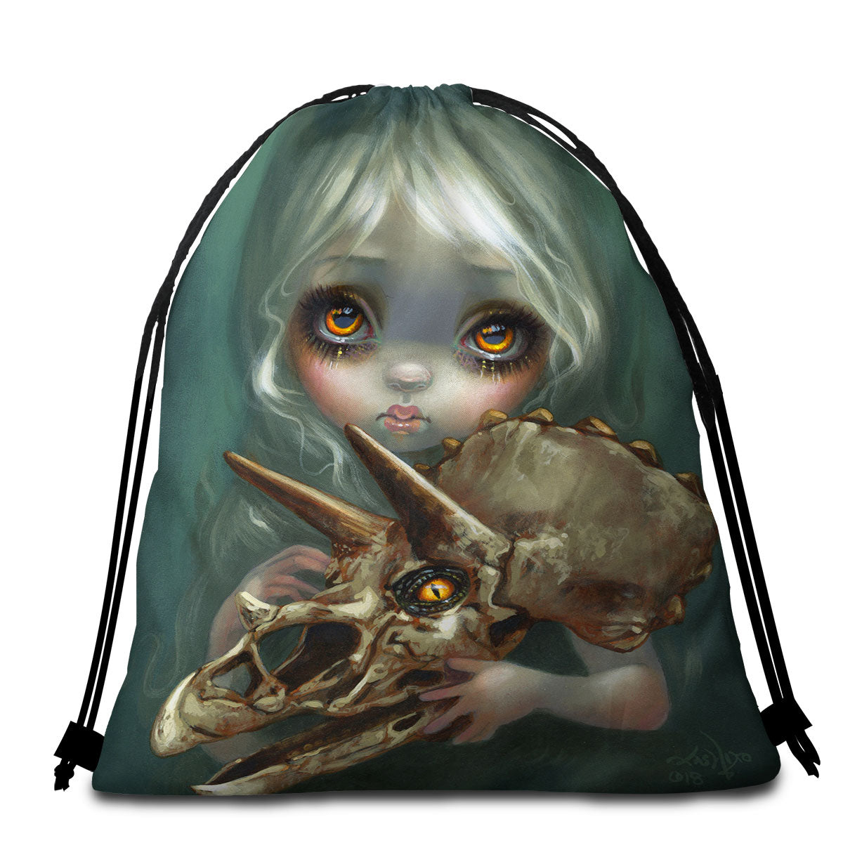 Cool Dark Art Girl Holds Resurrected Triceratops Beach Towel