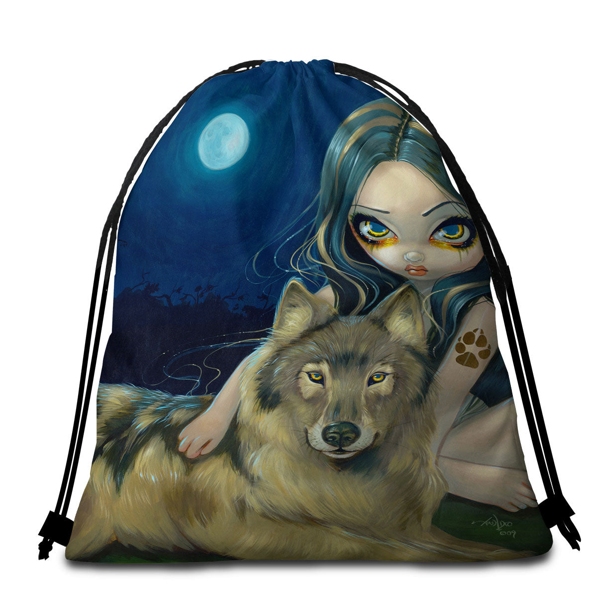 Wolf Moon Beautiful Girl Sitting with Her Wolf Microfiber Beach Towel