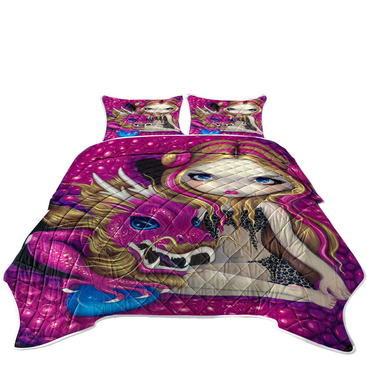 Shimmering Pink Dragon and Beautiful Big Eyed Girl Quilt